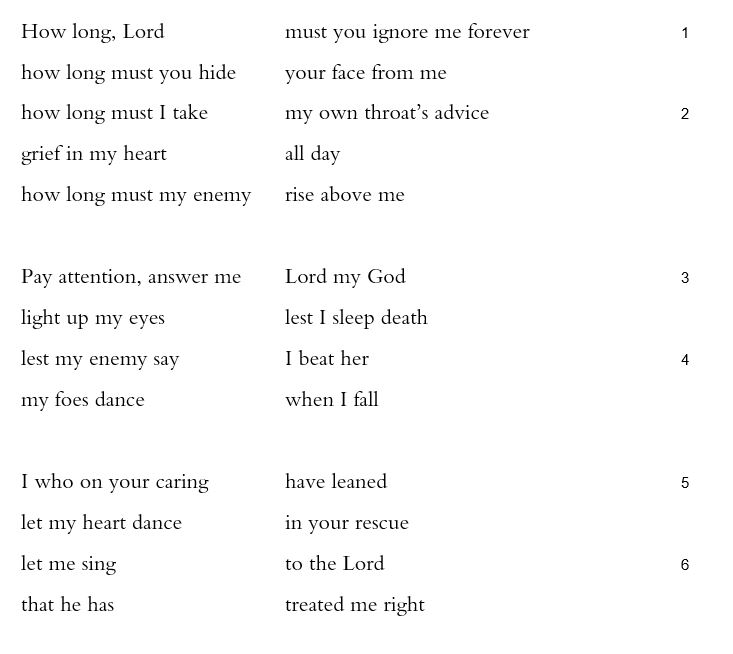 For five and a half verses, the anger and fear of this psalm’s plaint are perfectly clear. Aching and lonely from the outset, the speaker cries how long? Four times in two verses, she cries. Three urgent imperatives follow— “Pay attention, answer me… light up my eyes”—followed by three unwanted consequences: “lest I sleep death” (3b), “lest my enemy say | I beat her” (4a), and “my foes dance” (4b). The movement of both outcry and argument goes twice from God to the speaker to the enemy. “How long?” is asked twice about God (1a, 1b), once about the speaker (2a-b), and once about her enemy (2c). The imperatives follow a similar causal chain, from “Lord my God” (3a) to “lest I” (3b) to “lest my enemy… my foes” (4a, 4b). After these two verse pairs (1-2 and 3-4), the final pair softens to a plea as third-person wish becomes first-person: “let my heart dance… let me sing” (5b, 6a).