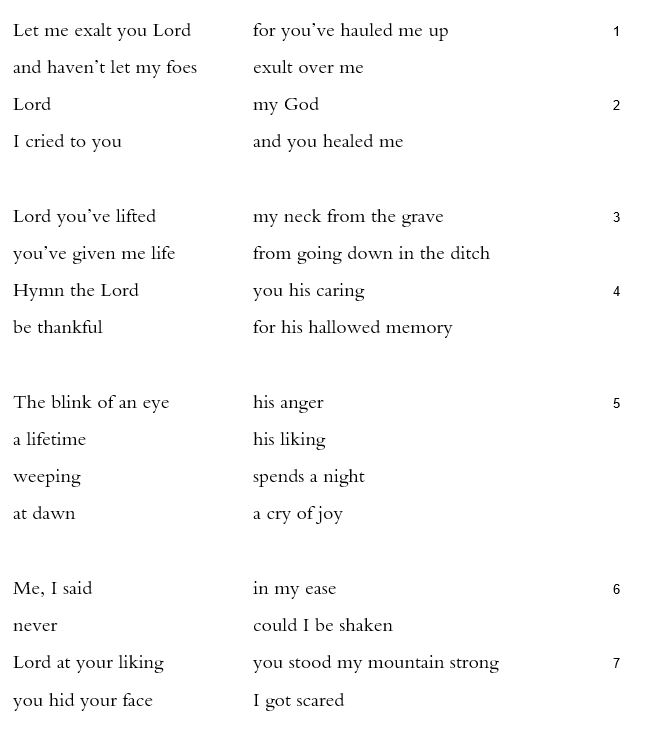 In Psalm 30, this general readerly dynamic is stretched even farther in one direction by the context, a public commemoration in or of the temple, and by the opposing pull of the psalm’s many appeals to private feeling. Psalm 30’s superscription and the plural imperatives of verse 4 tug our experience of the psalm towards the ceremonial and liturgical, a collective historical memorializing that dedicates the “house of David” through the singing and worship of the chasidav: “you, his caring / be thankful | for his hallowed memory.” Which house of David? The dynastic line? Solomon’s temple? The Second Temple? How different this psalm looks without the superscription or without verse 4.
