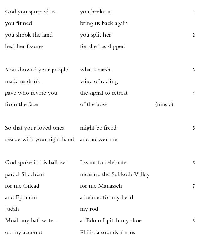 Even if biblical Hebrew had periods and quotation marks, would we want them? Our desire for clarity in poetry and song has to be weighed against the values of richness and complexity. In Psalm 60, for instance, God speaks with—or in— God’s own uniqueness, God’s sacral apartness, God’s “hallow.” God’s speech seems to begin with “I want to celebrate / parcel Shechem | measure the Sukkoth Valley” (6). It’s God who celebrates and metes out, the reader concludes, since the psalm’s previous first-person speaker is likely not positioned to apportion territory. Verses 7 and 8 also seem to be spoken by God: