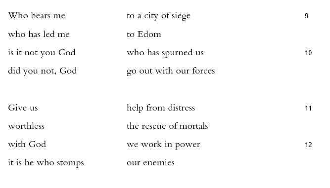 It’s verse 9 that makes quotation marks seem simultaneously desirable and unwanted. Does God’s speech continue here or has it ended? “Who bears me | to a city of siege” makes sense if God or the Lord is speaking from the Ark of the Covenant. Who else besides God would be borne this way, led to Edom? Joab? A king? Because we can’t tell for certain, the questions bear both divine weight and human intimacy. Open-endedness continues—grows, even— in the question asked in verse 10: “is it not you God | who spurned us”? Surely God is not asking this of God? But then who speaks now? The speaker from verse 5? Is this speaker asking, rhetorically, “who is it who leads us to battle with Edom, God, if not you, the selfsame God who rejected us before?” Is the speaker on the battlefield trying to jog God’s memory? The negative question “is it not” gives this passage extra force. We know the answer should be “yes,” but wonder a moment all the same.