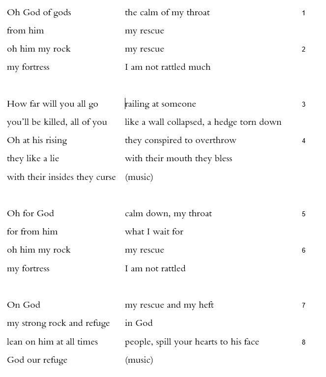 “Once God spoke | twice I heard this,” the speaker of Psalm 62 says near the end of this duplicative, twice-heard poem (62:11). The first and third stanzas, verses 1-2 and 5-6, are near-doubles that work as a refrain. Partly the lines repeat: “from him | my rescue / oh him my rock | my rescue / my fortress” (1b-2 =5b-6). But differences between verses 1a and 5a seem less like variations on a theme and more like textual variants, “Oh God of gods | the calm of my throat” becomes “Oh for God | calm down, my throat.” To be fair, that first version might just be a preposition and the name “God”—“Oh to God.” But if the first stanza does locate God within the company of plural gods (‘el ‘elohim can easily be read this way) before the third stanza refers to just a singular God (l‘elohim), then that third stanza functions almost as a kind of corrective, an erasure of those other gods.