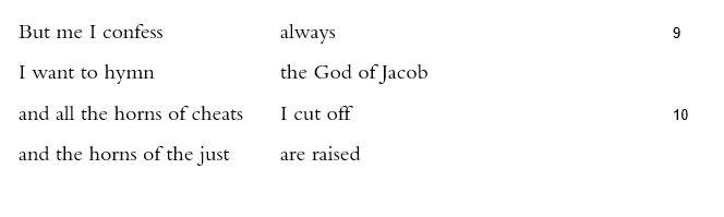 All that would seem left for the psalm is for the speaker to express the obvious, that this hymn stands against such cheats, and knows its place (9). But it still has one more turn. God, who has spoken and been spoken about, who has held and poured his cup of wine, speaks once more, also stating the obvious, that “all the horns of cheats | I cut off / and the horns of the just | are raised” (10). These last two verses are linked by a pun that makes their call and response seem linguistically inevitable. “I confess,” the speaker says, ’aggid. ’Aggade`a, God responds, “I cut off.”
