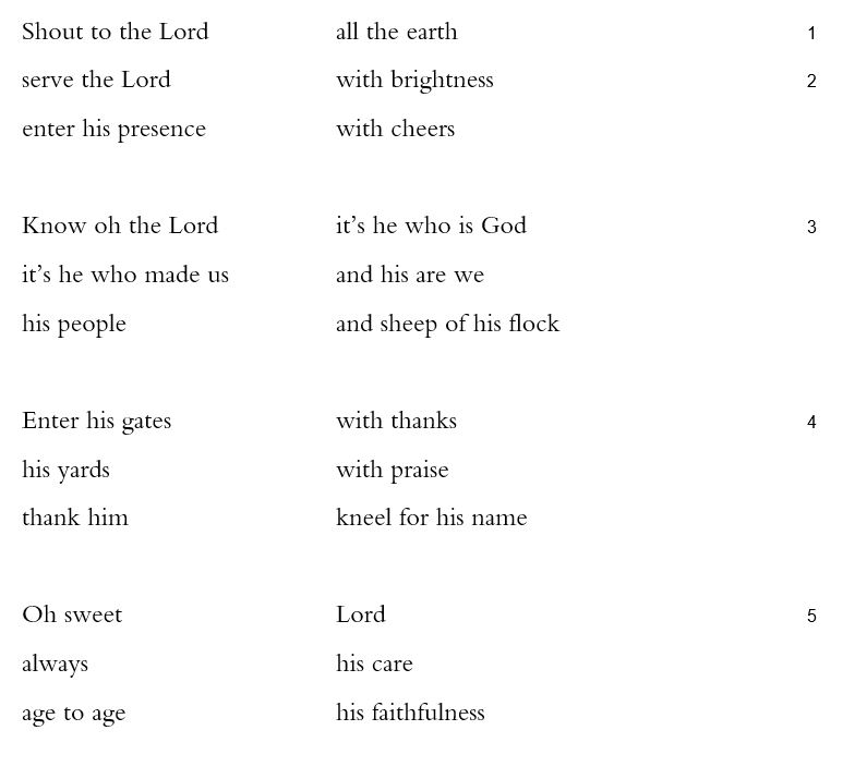The crest of the wave of psalms that begin Book Four, Psalm 100 is as taut as can be. A single twelve-line composition, it works as three quatrains, even better as four tercets. In four tercets, the psalm’s seven plural imperatives are patterned 3-1-3 across the first three stanzas. The trio “shout” (1), “serve,” and “enter” (2) is mirrored by “enter,” “thank,” and “kneel” (4), the abstract “serve” pairing with the abstract “thank,” a riotous shout stilling to a kneel. In the middle of these six imperatives— linked by proximity more to the first group of three— is the verb “know,” the psalm’s central imperative. This knowing has three tenets: “it’s he who is God / it’s he who made us | and his are we” (3). And yet there is only one declarative verb within this sequence of what is to be known: “that the Lord, he, God, he, made us, his, we,” a word-for-word rendering might go, awkwardly indicating how emphatically the pronoun chain “he… he… his… we” reinforces the singular point that creation implies a particular relation. Taken all together, the structure of imperatives locates knowing between serving and thanking, weaving those mental actions within more physical actions, shouting, entering, entering, kneeling.