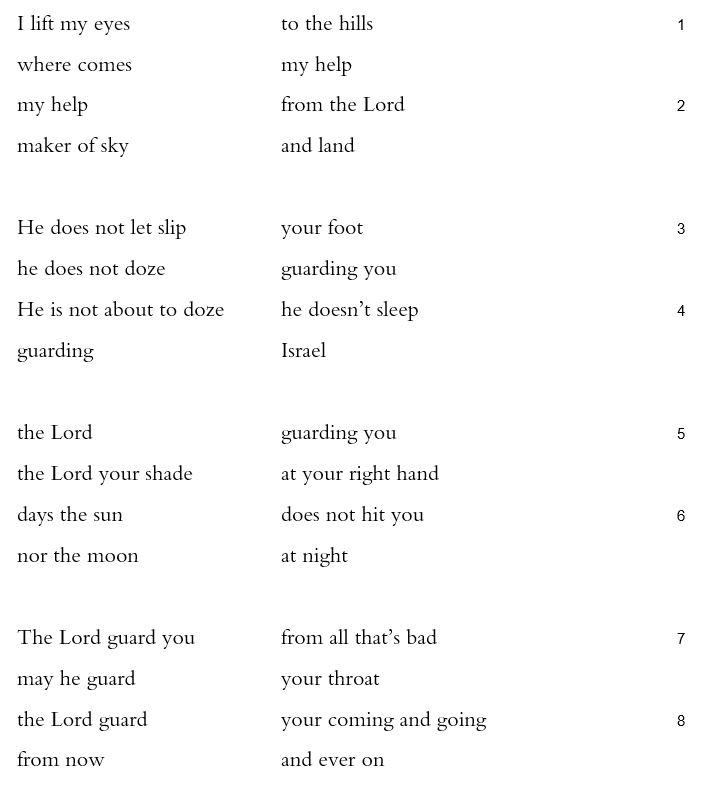 At first glance or at five hundredth, the psalm’s gestures of comfort are plain. A person needs. She yearns. She lifts her eyes up the ridgetops to the ranges where earth and air meet, “to the hills” (1) at the edge of “sky | and land” (2). In most English translations, she asks where her help comes from. In the King James Version, she assures herself that her help does come from the hills. The Hebrew is ambiguous. A good director might suggest the actor deliver the psalm’s first verse equal measures worry and pep talk: “where comes | my help.” Verse 2, likewise, could be delivered by a skilled actor as half an assertion— “my help [is] | from the Lord” (2a)— and half a continued question: “where comes | my help / my help | from the Lord” (1b-2a). In measures, the psalm registers both confidence and anxiety, in its gesture of lifting eyes.