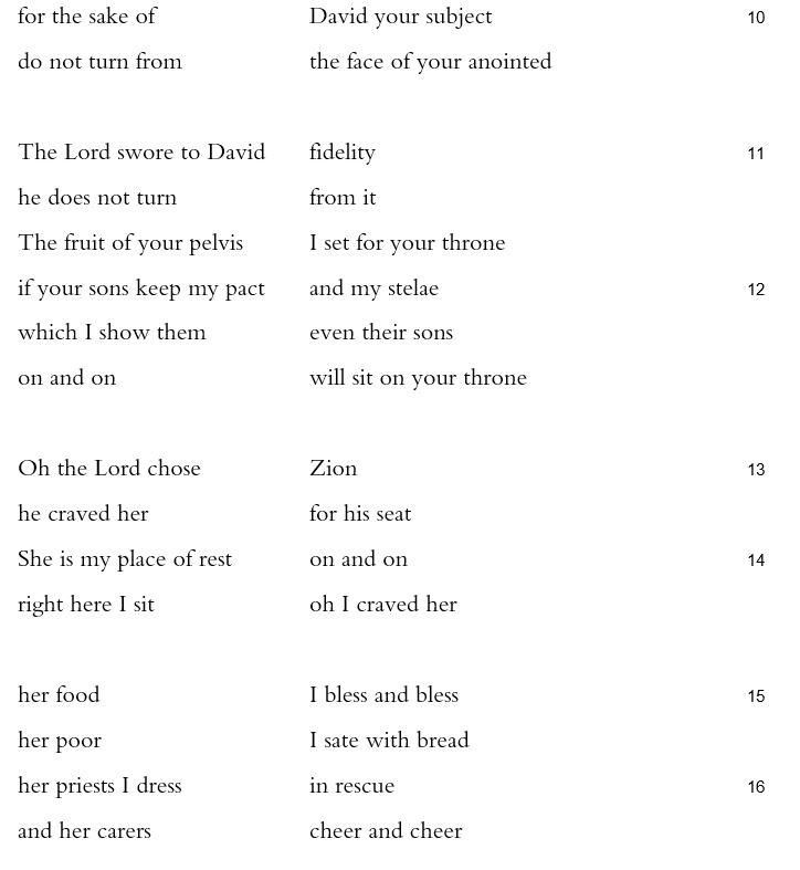 Indeed perhaps the most telling lines in the psalm are those that deal with the priests and the chasidim, the ones who care and are cared-for: “May your priests | dress in justice / may your carers | cheer” (9) and “her priests I dress | in rescue / and her carers | cheer and cheer” (16). The psalm may dangle a symbolic messianic hope at the end, a horn, a lamp, and a flowering crown, but the true heroes of the psalm are not future kings, but present-tense priests, the makers of memories.