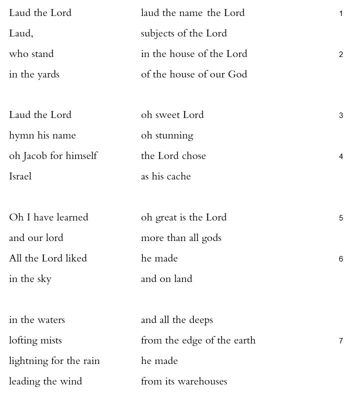 The psalm feels very much like an expansion, an explosion, of the psalms that precede it, into which have been inserted bits and passages from all over, the whole thing introduced with formulas of praise. “Laud the Lord | laud the name the Lord,” the psalm begins (135:1), urging those who just, in the previous psalm, blessed the Lord (“all subjects | of the Lord / who stand in the house | of the Lord by night” 134:1) to now praise: “Laud, | subjects of the Lord / who stand | in the house of the Lord / in the yards | of the house of our God” (135:1b-2). The next verse reaches back to Psalm 133, repeating the words “sweet” (tov) and “stunning” (na`im), only paired in these two verses (133:1, 135:3; cf. 147:1). The prior psalms’ forward-looking blessings have become Psalm 135’s backward-looking praise. The psalm reaches back all the way to creation (135:6-7) and to Exodus (135:5 || Exod 18:11; 135:8 || Exod 12:12; 135:13 || Exod 3:15) and Deuteronomy (135:4 || Deut 7:6, cf. 32:9; 135:10-11 || Deut 4:46, 31:4; 135:12 | Deut 4:38 and often; 135:14 || Deut 32:36). Other psalms and poetry also appear to be included, by quotation (135:7 = Jer 10:13, 51:16) and near-quotation (135:6 || 115:3) , though determining the direction of allusions is often educated guesswork. Does Psalm 136:17-22 quote Psalm 135:10-12 or vice versa? In the case of Psalm 115:4-11 and Psalm 135:15-20, it’s logically simpler to assume that Psalm 135 adds the Levites in 135:19 than to explain why Psalm 115 would leave them out. And it is far simpler to assume that Psalm 135:17b energizes and extends the expected “a nose theirs | they do not smell” of 115:6 to “a nose—there is no | breath in their mouths.”