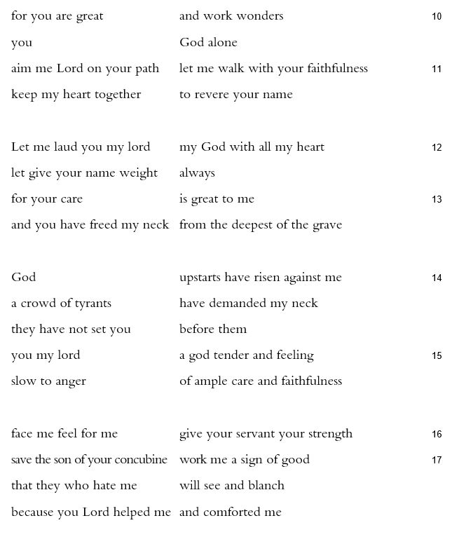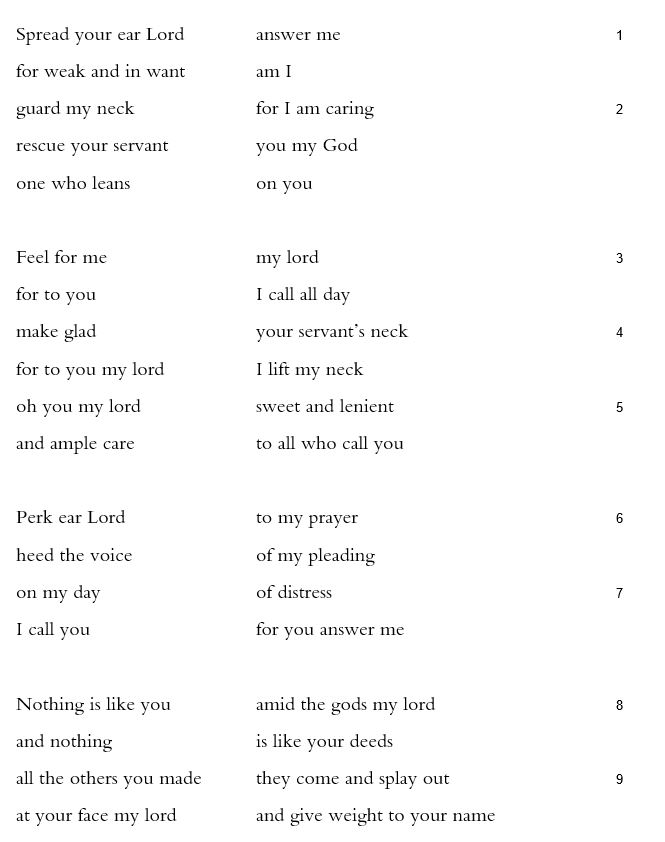 Nearly all of the first three stanzas is spent on repetitive, conventional gestures of deference and beseeching. The speaker is “your servant” (2, 4), represented here only by his throat (2, 4 x2, cf. 13, 14), which appeals to God (2) as Lord (1, 6) but more as “my lord” (3, 4, 5). Quotations and conventions abound in every verse, from the prayer of Hezekiah “Spread your ear Lord” (Ps 86:1, 2 Kgs 19:16; cf. Pss 31:2, 71:2, 88:2), to the phrases “weak and in want” (Pss 86:1, 40:17, Deut 24:14, Job 24:14, and more), “guard my neck” (Pss 86:2, 25:20), “for I am caring” (Ps 86:2, Jer 3:12), “feel for me” (Pss 86:3, 6:2, 31:9, and more), “to you | I call” (Pss 86:3, 28:1, 30:8), “to you my lord | I lift my neck” (Pss 86:4 = Ps 25:1, with the change from “Lord” to “my lord”), “ample care” (Ps 86:5, 15, Num 14:18, Joel 2:13), “perk ear… to my prayer” (Pss 86:6, 17:1, 55:1), “on my day | of distress” (Pss 86:7, 77:2), “I call you | for you answer me” (Pss 86:7, 17:6, with a change of verb form). It’s more pastiche than pathos.
