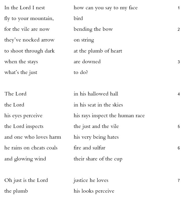 For five and a half verses, the anger and fear of this psalm’s plaint are perfectly clear. Aching and lonely from the outset, the speaker cries how long? Four times in two verses, she cries. Three urgent imperatives follow— “Pay attention, answer me… light up my eyes”—followed by three unwanted consequences: “lest I sleep death” (3b), “lest my enemy say | I beat her” (4a), and “my foes dance” (4b). The movement of both outcry and argument goes twice from God to the speaker to the enemy. “How long?” is asked twice about God (1a, 1b), once about the speaker (2a-b), and once about her enemy (2c). The imperatives follow a similar causal chain, from “Lord my God” (3a) to “lest I” (3b) to “lest my enemy… my foes” (4a, 4b). After these two verse pairs (1-2 and 3-4), the final pair softens to a plea as third-person wish becomes first-person: “let my heart dance… let me sing” (5b, 6a).