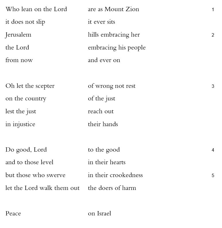 A marvelous interweaving of lines, Psalm 126 shows in its few verses that biblical poetics needs for an operating principle, its ars poetica, only the two-step of parallelism. If we feel like it, we readers can measure syllables and mark rhymes. But pairs and binaries are as simple and varied as tides: between the lows and highs so much is alive.