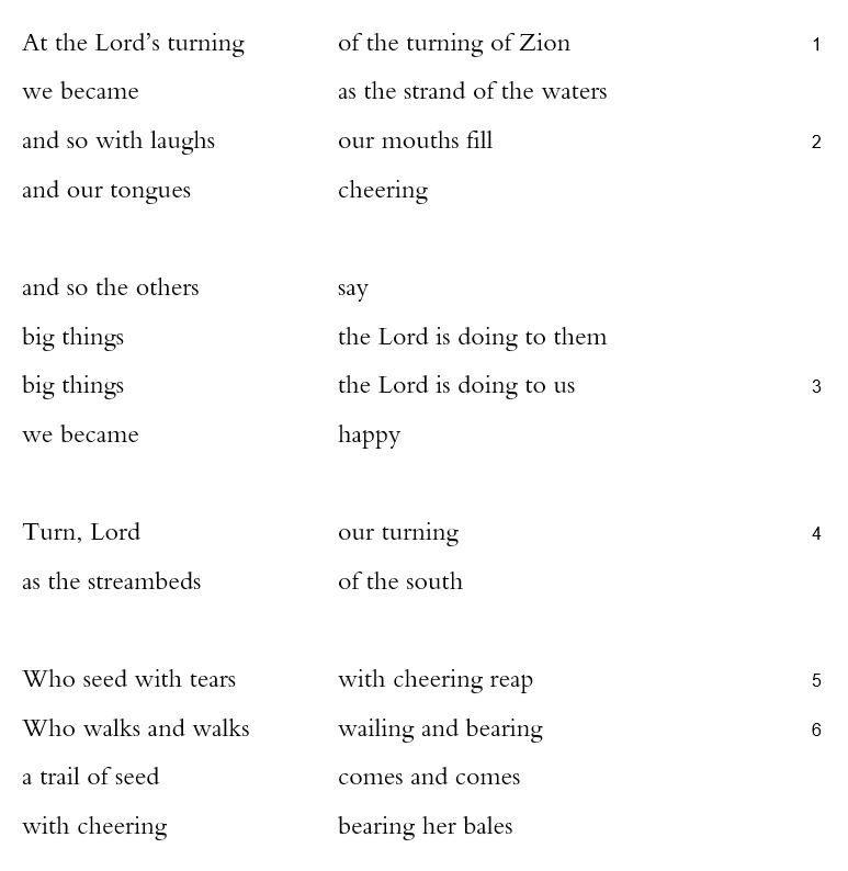 Just as the psalm’s first four verses move from what is known to what’s new— as we were happy, make us happy again— the psalm’s last two verses move from what sounds like a maxim (“Who seed with tears | with cheering reap”) to its elaboration (“Who walks and walks | wailing… comes and comes | with cheering”). The doubled “cheering” (lit. “shout”) of verses 5 and 6 recalls the pairing of “laughs” and “cheering” of verse 2. The proximate repetition of “seed” and “cheering” and “bearing” calls to mind not just the turnings, but also the doubled “big things | the Lord is doing.” As at a satisfying dance, everyone has a partner for turning.