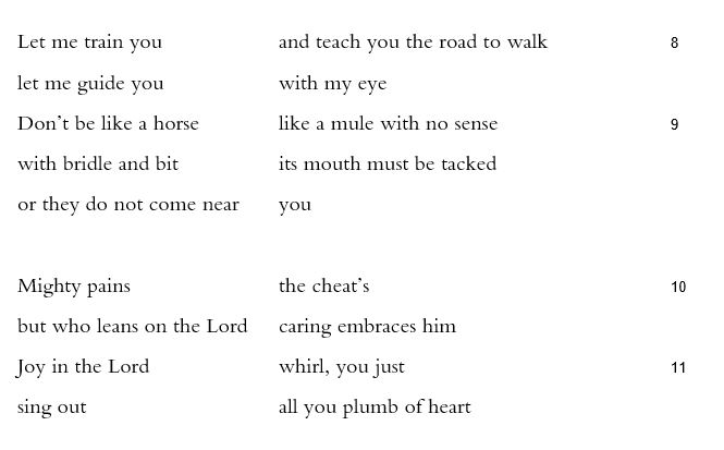 To Psalm 89’s credit, it eliminates easy solutions. Its long central section (19-37) narrates the Davidic “pact”(28, 34, cf. 3, 39) in God’s first-person voice. Its movement is both temporal and outside of time. It begins with the word “then” and a series of perfective verbs, “I appointed… I lifted… I came upon David… I anointed him” (19-20). There follows a torrent of imperfect verbs that express both a historical present, a past subjunctive that reveals a purpose, as well as a present and a future: “so that my hand with him | might be anchored / and more my arm | might make him strong” (21). To translate these in the future tense is to presuppose a solution the psalm does not decide on. Later in the series of verbs, the present and future senses do dominate: