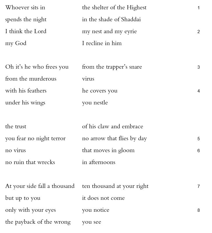 Three distinct trajectories make Psalm 91 more compelling than it first appears. The first is the unfolding of a single extended metaphor: God as a raptor, God’s devotee the raptor’s fledgling. The scene is a mountain, and the vocabulary ornithological, most explicitly in verse 4: “with his feathers | he covers you / under his wings | you nestle.” The dangers facing a juvenile bird are many, as are the threats to even those grown. But, the psalm asserts, “it’s he who frees you | from the trapper’s snare” (3), that in “the trust | of his claw and embrace”