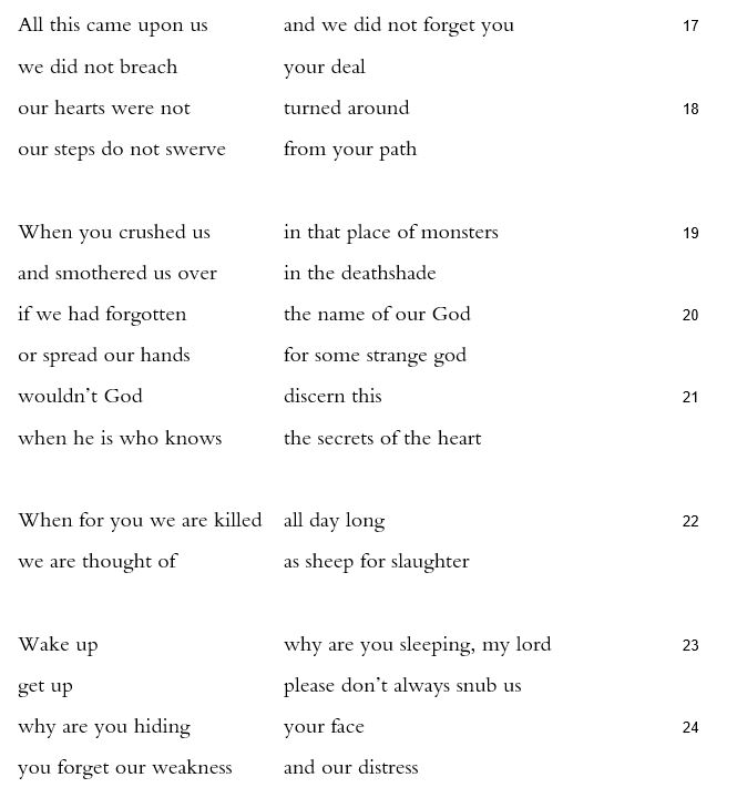 By contrast with the preceding double psalm, which mentions God’s name 27 times, Psalm 44, which is longer, names Elohim only 5 times. The effect is to highlight God’s absence. In Psalm 42, it was the speaker’s enemies who asked, “where is your God?” (42:3, 10). Here, the speaker wonders much the same thing: “why are you sleeping, my lord” (23), “why are you hiding | your face” (24).