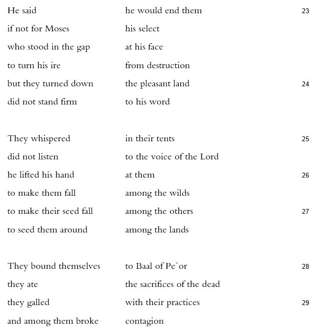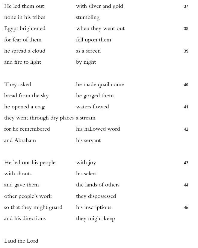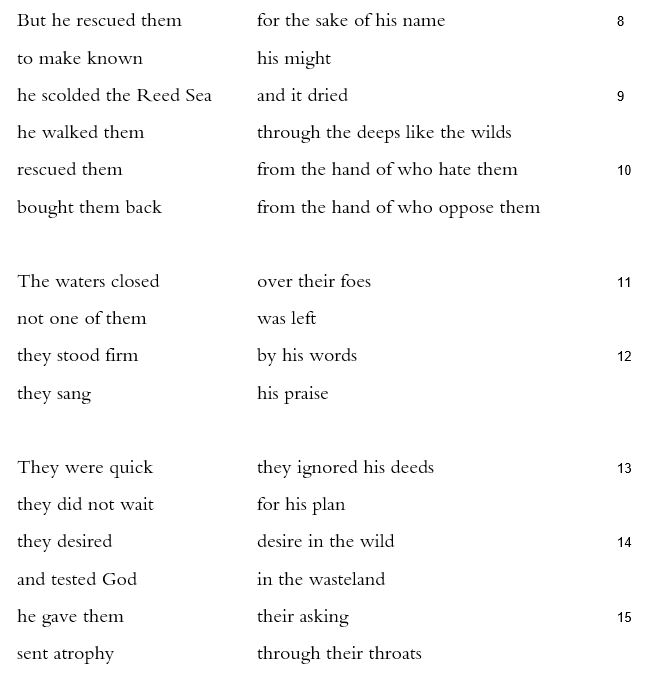 Narratively, the central line of the psalm—“Look, a gift of the Lord | sons”—shows the second unseeable benefit of the seeming fruitlessness of work and sleep: a specific kind of fertility. Obviously procreation is sleep-adjacent rather than a product of sleep itself, but the poem still jump-cuts (“his dearest | sleep / Look, a gift”) from loving sleep to children, presented in a thoroughly masculine way as the fruit of the procreative torso, the belly. Mothers are elided here in the juxtaposition of affectionate sleep and sons. Verses 3 and 4 both sound aphoristic, one stressing male children’s economic value—“a gift” (literally, “inheritance”) and “income” (3)— the other the aggressive virility of both fathers and sons as “arrows | in a champion’s hand” (4).