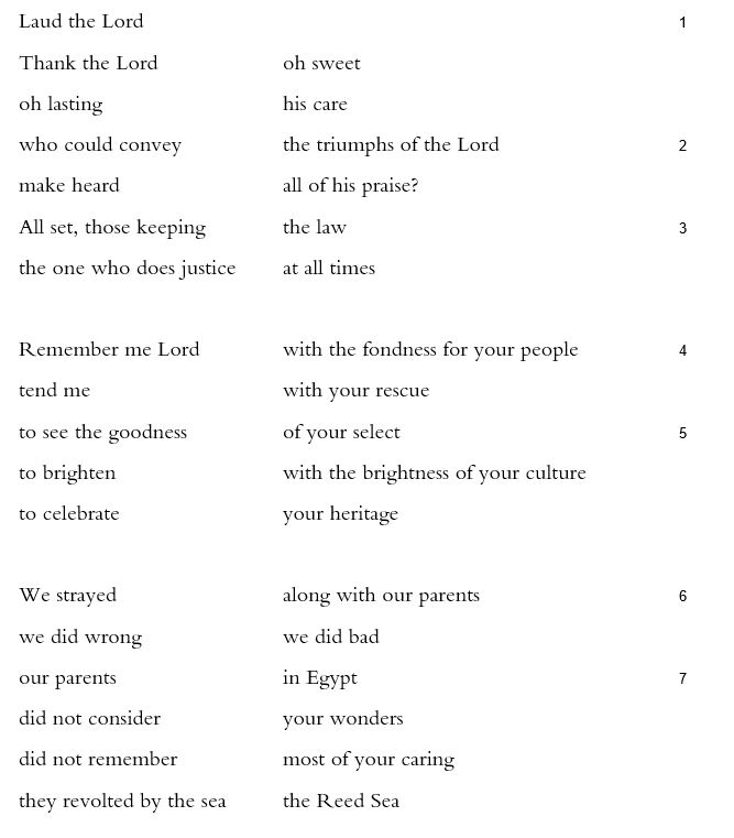 That word shav’ for pointlessness, rendered here by the rhetorical question, “for what,” is also undone at the end of verse 2 by the troublesome word sheina’, “sleep.” The two words are consonantally barely half a stroke away, shin-vav-aleph and shin-nun-aleph looking almost the same. There is thus an interesting slide from the fruitlessness of work done without divine support to the seeming fruitlessness of sleep. Is effort worthless, according to verse 2? Apparently not. Waking early, retiring late, working hard: “thus he gives his dearest | sleep.” The Lord’s cure for insomnia seems to be a long day of labor. In context, however, verse 2 becomes more than a factory poster touting industry over indolence: the Lord may be needed for construction and maintenance and everything urban in between, but work still makes the day and night go round.