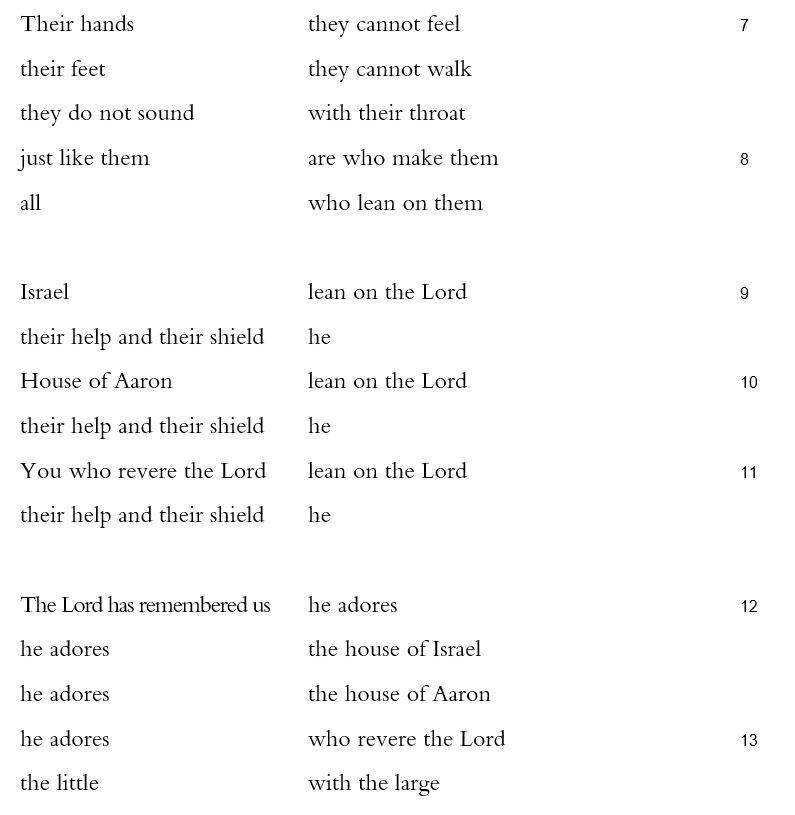 The exact nature of the transformation is harder to pinpoint, though the psalm’s contours show pivotal moments in the rite. After the fourfold beginning, “oh sweet / oh lasting | his care” (1-4), a first-person speaker testifies to having called for help (5), demonstrating her allegiance to the Lord rather than to anyone else: